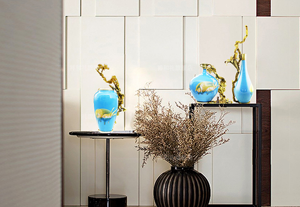 首先給彩瓷加了一個(gè)銅底座、銅沿口,然后把熔化后的銅水倒進(jìn)沙里,形成不同自然形狀后再與彩瓷底座和沿口相連,效果出人意料的好,厚重與輕脆相融,古樸與現(xiàn)代結(jié)合,也不知是瓷攀上了銅,還是銅纏上了瓷。相得益彰,妙不可言。